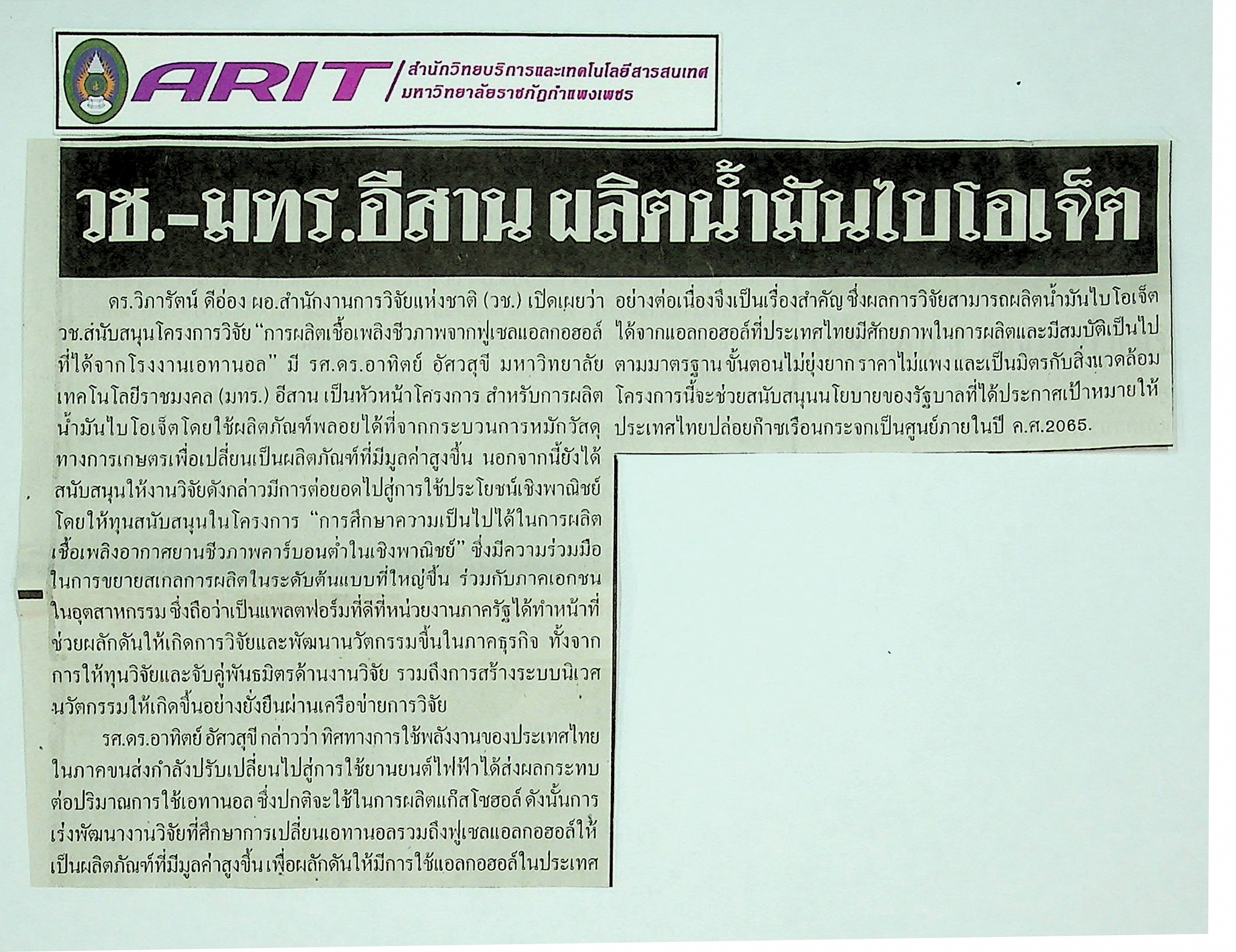 | หัวข้อข่าว | วช.-มทร.อีสาน ผลิตน้ำมันไบโอเจ็ต | ผู้จัดทำ | น.ส.มาลี ประสงค์ดี |