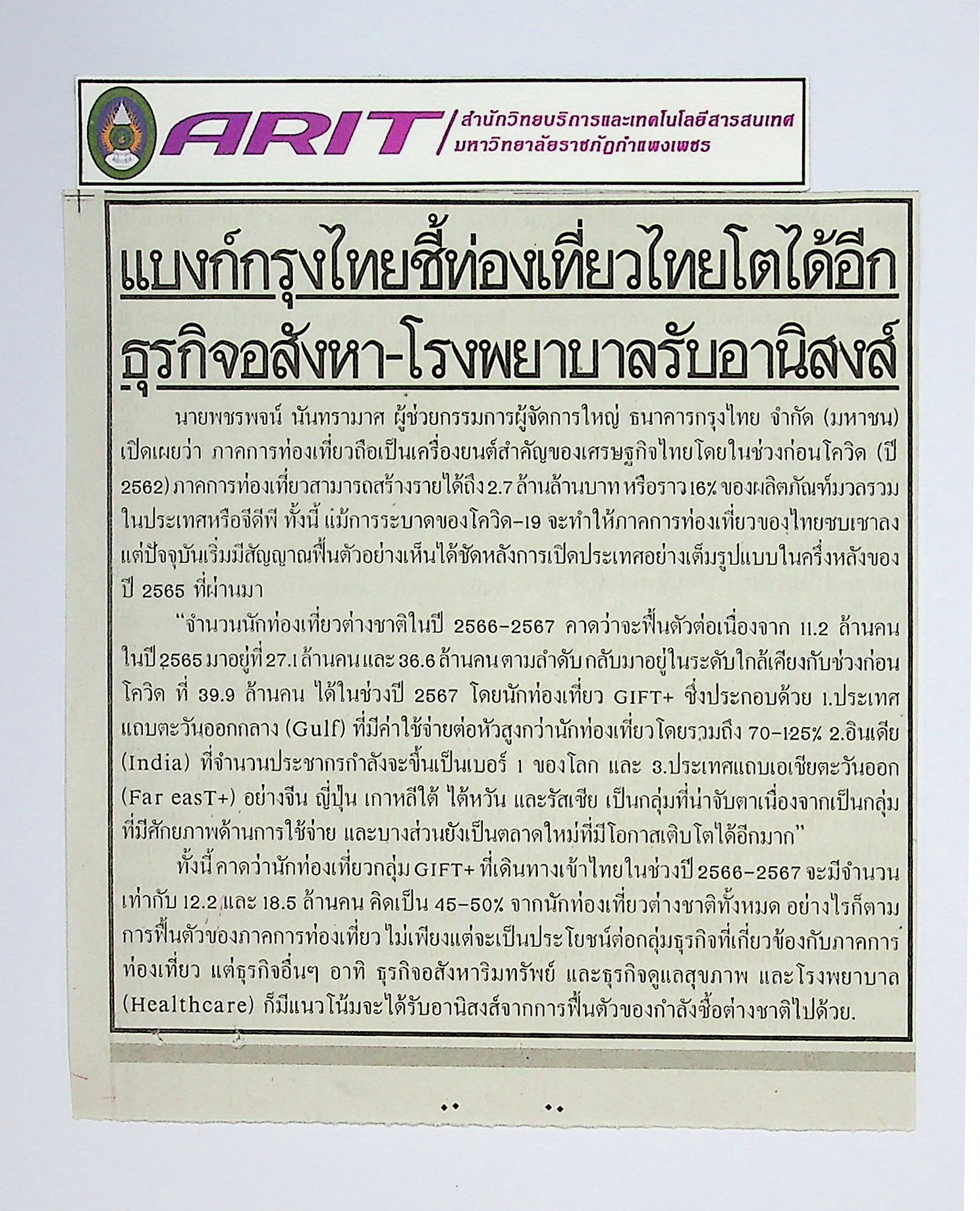 | หัวข้อข่าว | แบงก์กรุงไทยชี้ท่องเที่ยวไทยโตได้อีก ธุรกิจอสังหา-โรงพยาบาลรับอนิสงส์ | ผู้จัดทำ | น.ส.มาลี ประสงค์ดี |