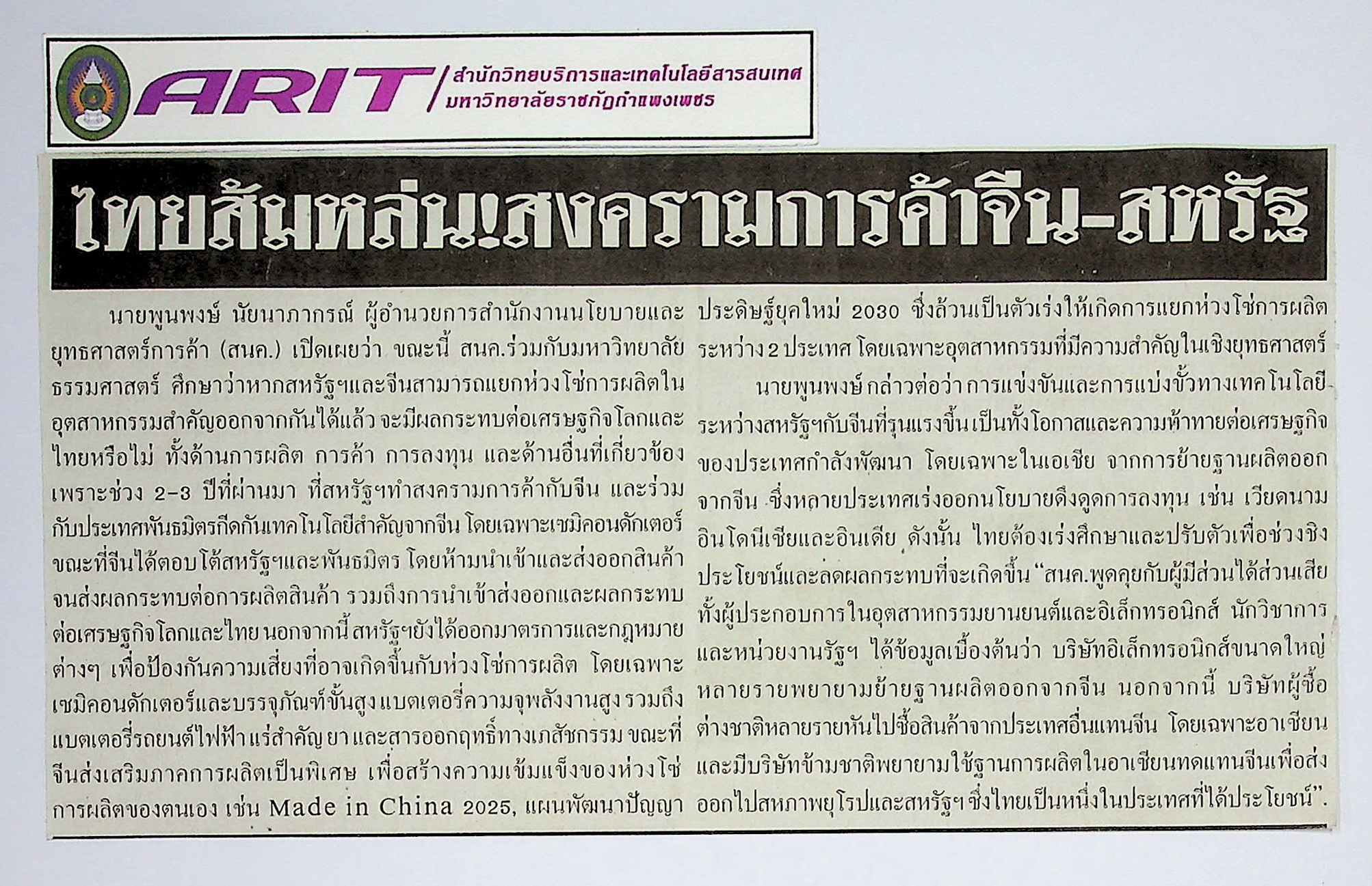 | หัวข้อข่าว | ไทยส้มหล่น สงครามการค้าจีน - สหรัฐ | ผู้จัดทำ | น.ส.มาลี ประสงค์ดี |