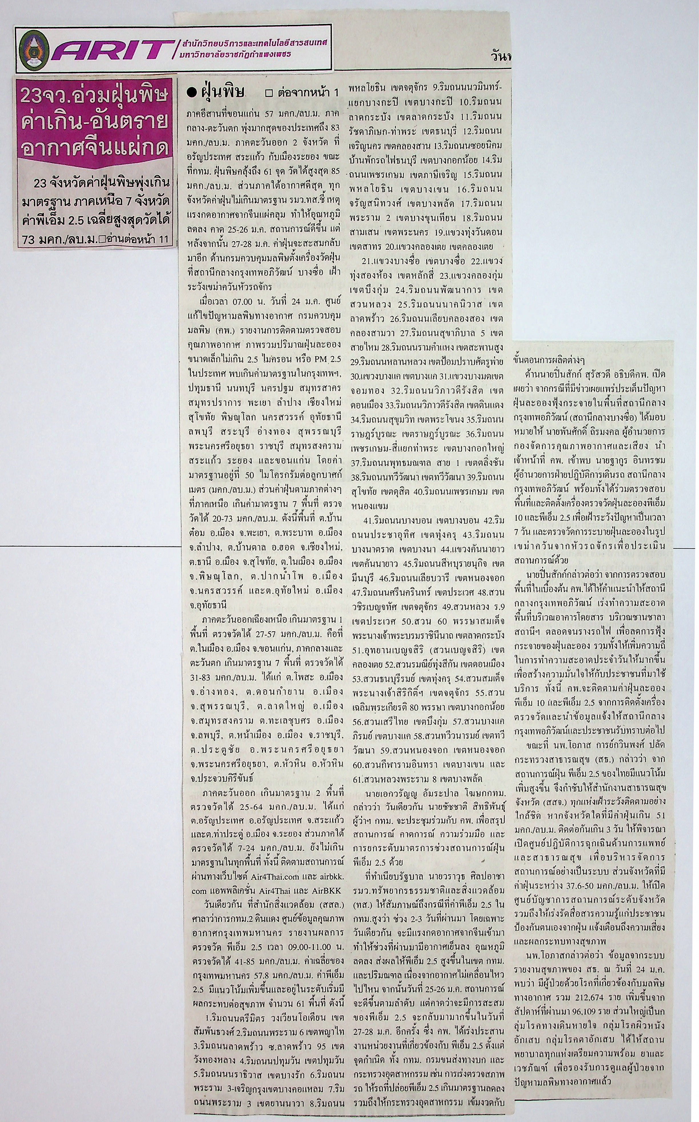 | หัวข้อข่าว | 23 จว. อ่วมฝุ่นพิษค่าเกิน-อันตราย อากาศจีนแผ่กด | ผู้จัดทำ | น.ส.มาลี ประสงค์ดี |