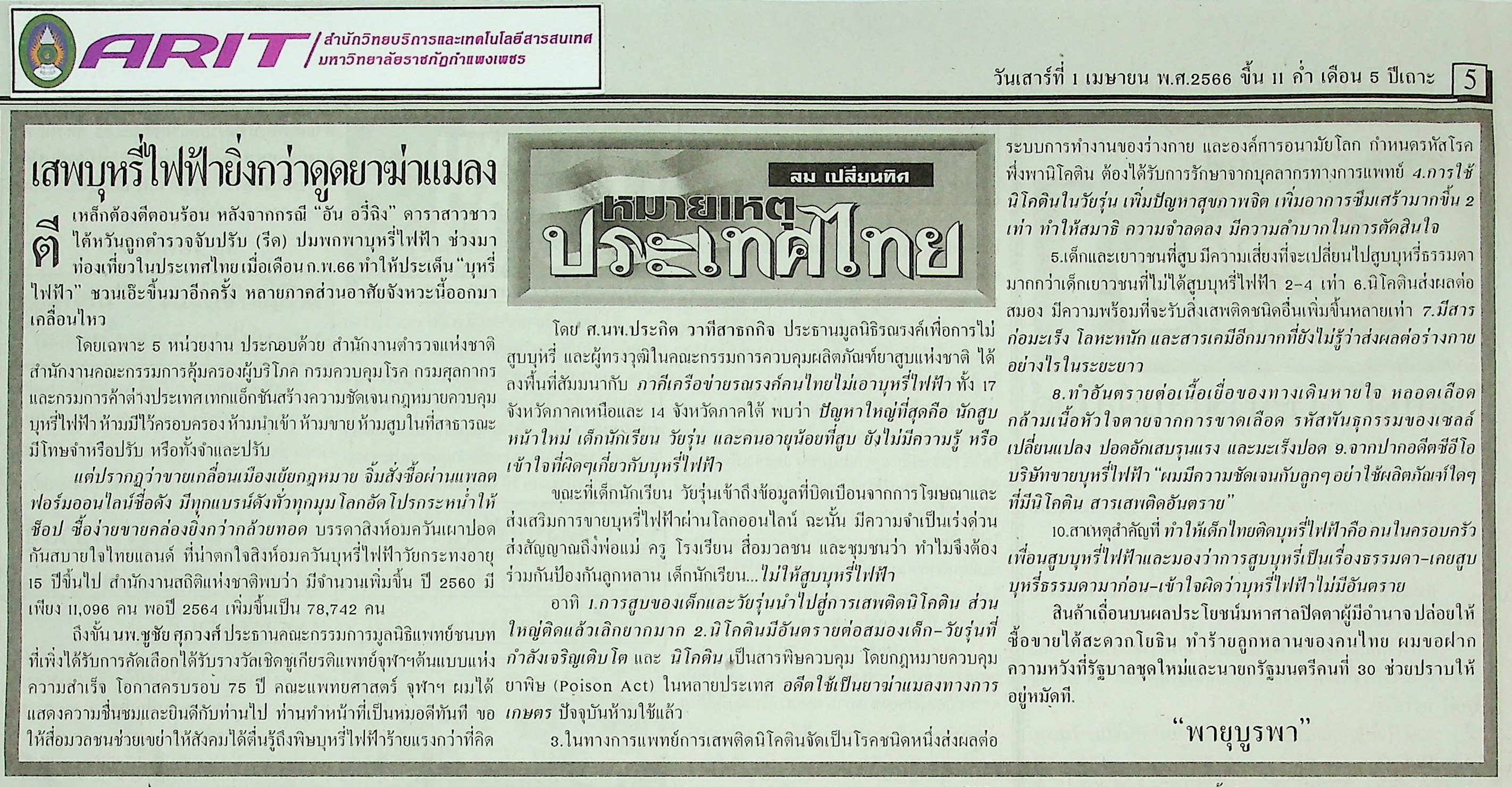 | หัวข้อข่าว | เสพบุหรี่ไฟฟ้ายิ่งกว่าดูดยาฆ่าแมลง | ผู้จัดทำ | น.ส.มาลี ประสงค์ดี |