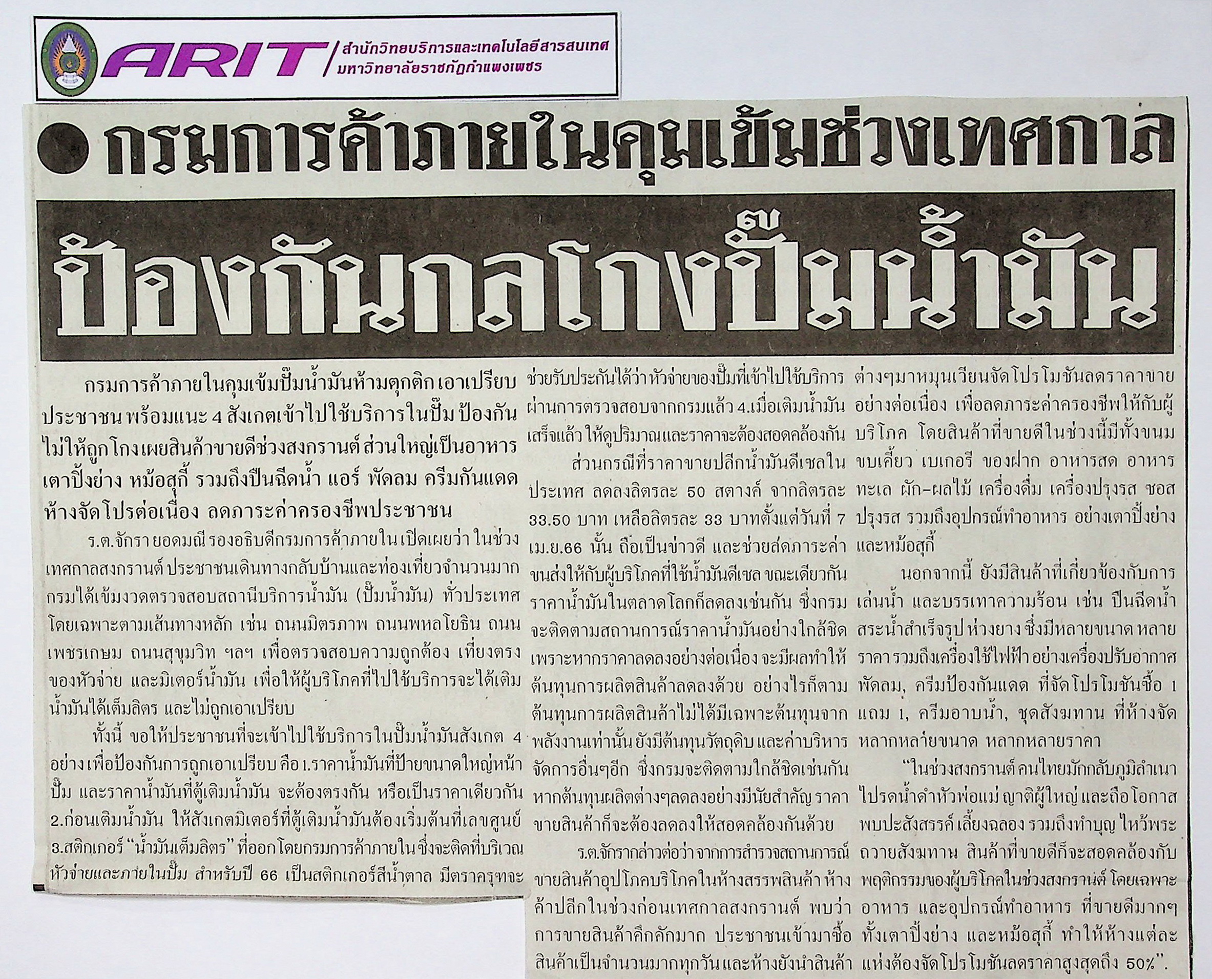 | หัวข้อข่าว | กรมการค้าภายในคุมเข้มช่วงเทศกาล ป้องกันกลโกงปั๊มน้ำมัน | ผู้จัดทำ | น.ส.มาลี ประสงค์ดี |