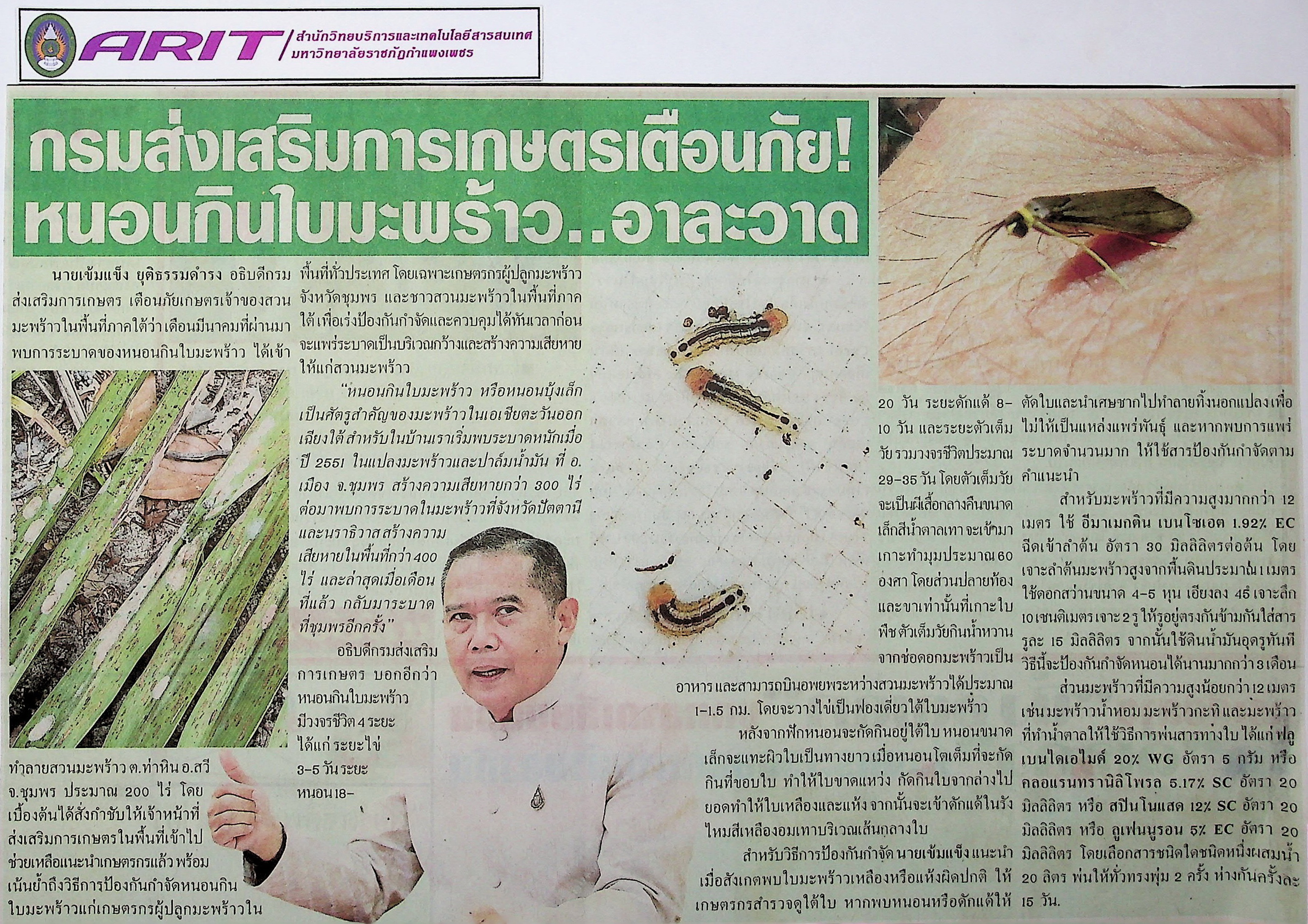 | หัวข้อข่าว | กรมส่งเสริมการเกษตรเตือนภัย หนอนกินใบมะพร้าว...อาละวาด | ผู้จัดทำ | น.ส.มาลี ประสงค์ดี |
