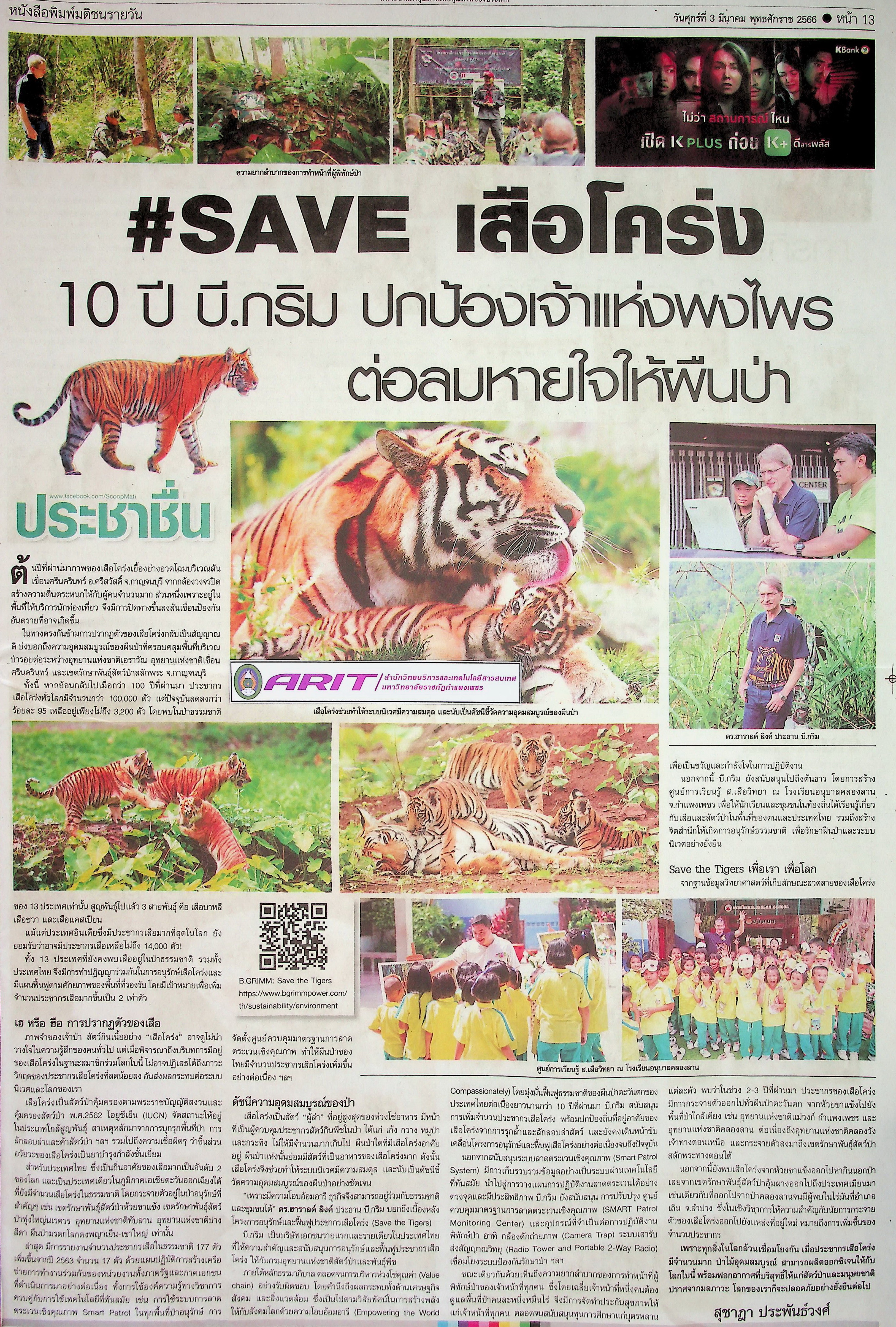 | หัวข้อข่าว | save เสือโคร่ง 10 ปี บี.กริม ปกป้องเจ้าแห่งพงไพร ต่อลมหายใจให้ผืนป่า | ผู้จัดทำ | น.ส.มาลี ประสงค์ดี |