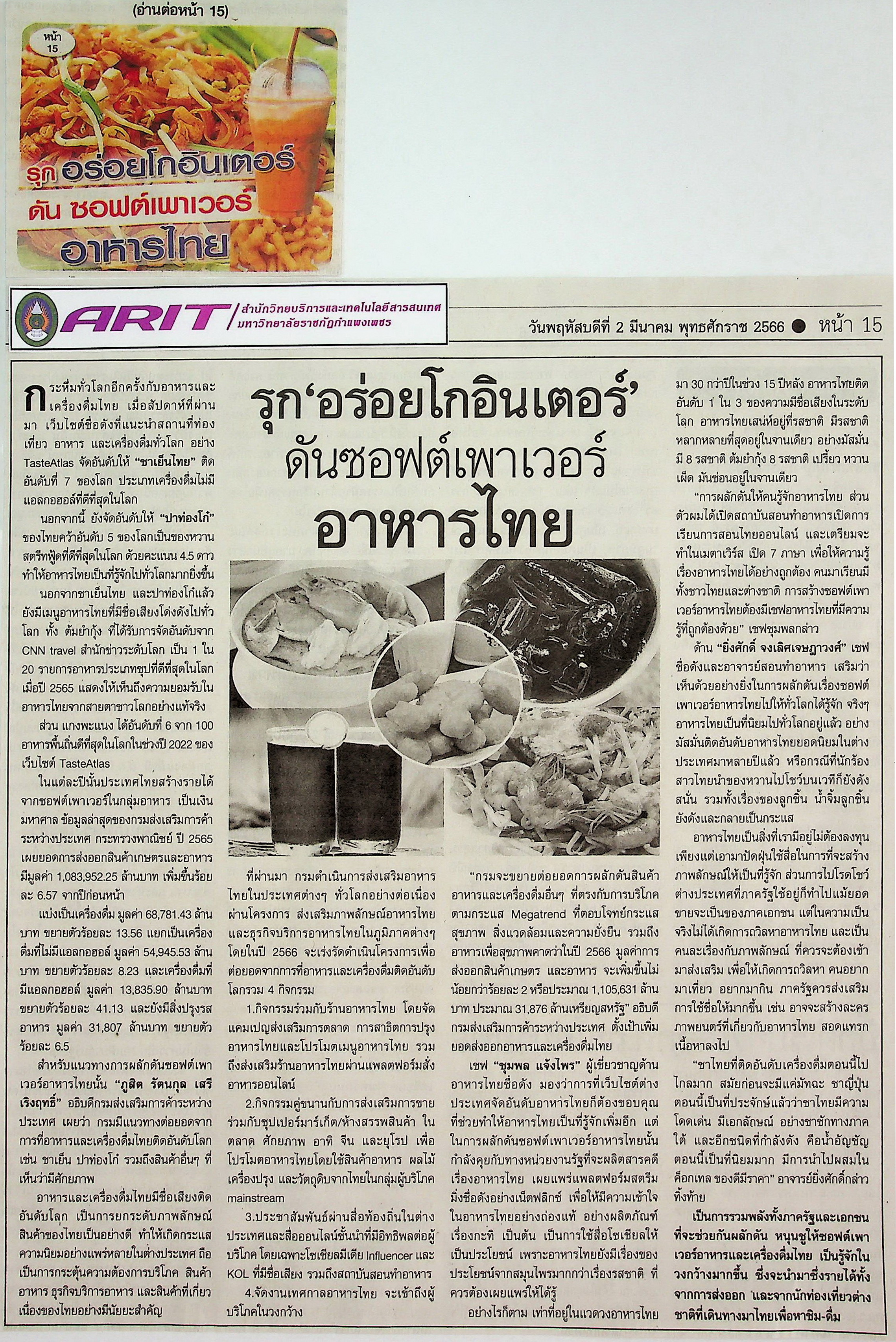 | หัวข้อข่าว | รุก "อร่อยโกอินเตอร์" ดันซอฟต์เพาเวอร์ อาหารไทย | ผู้จัดทำ | น.ส.มาลี ประสงค์ดี |