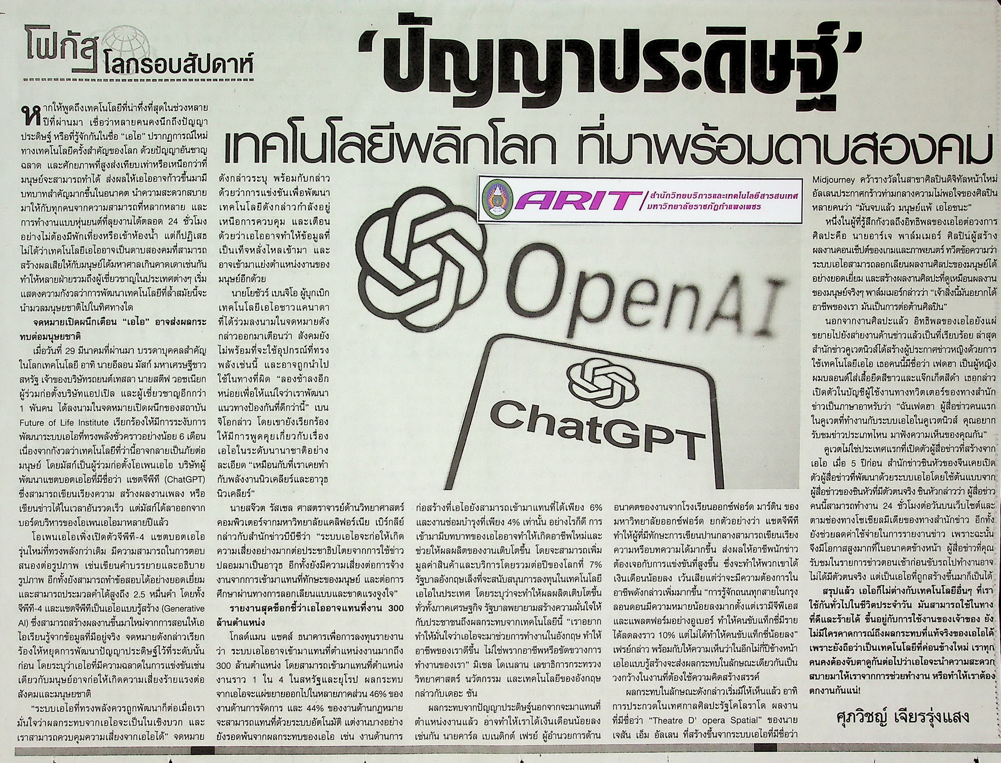 | หัวข้อข่าว | ปัญญาประดิษฐ์ เทคโนโลยีพลิกโลก ที่มาพร้อมดาบสองคม | ผู้จัดทำ | น.ส.มาลี ประสงค์ดี |