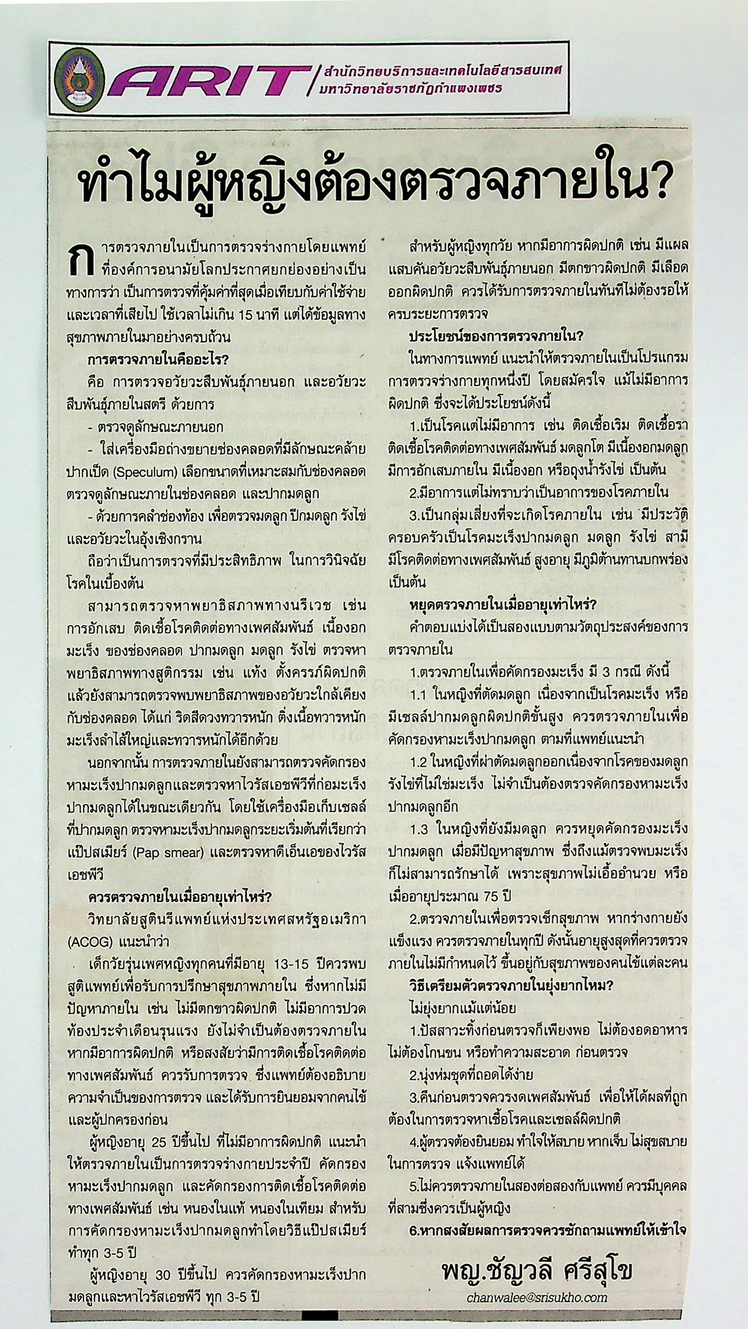 | หัวข้อข่าว | ทำไมผู้หญิงต้องตรวจภายใน | ผู้จัดทำ | น.ส.มาลี ประสงค์ดี |