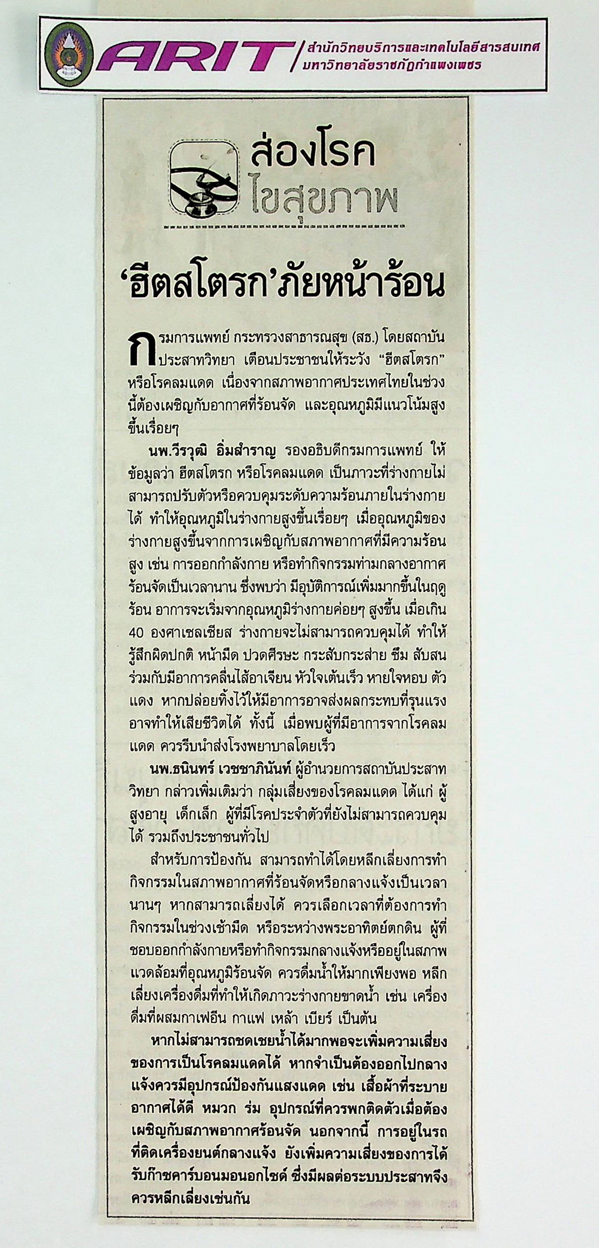 | หัวข้อข่าว | ฮีตสโตรก ภัยหน้าร้อน | ผู้จัดทำ | น.ส.มาลี ประสงค์ดี |