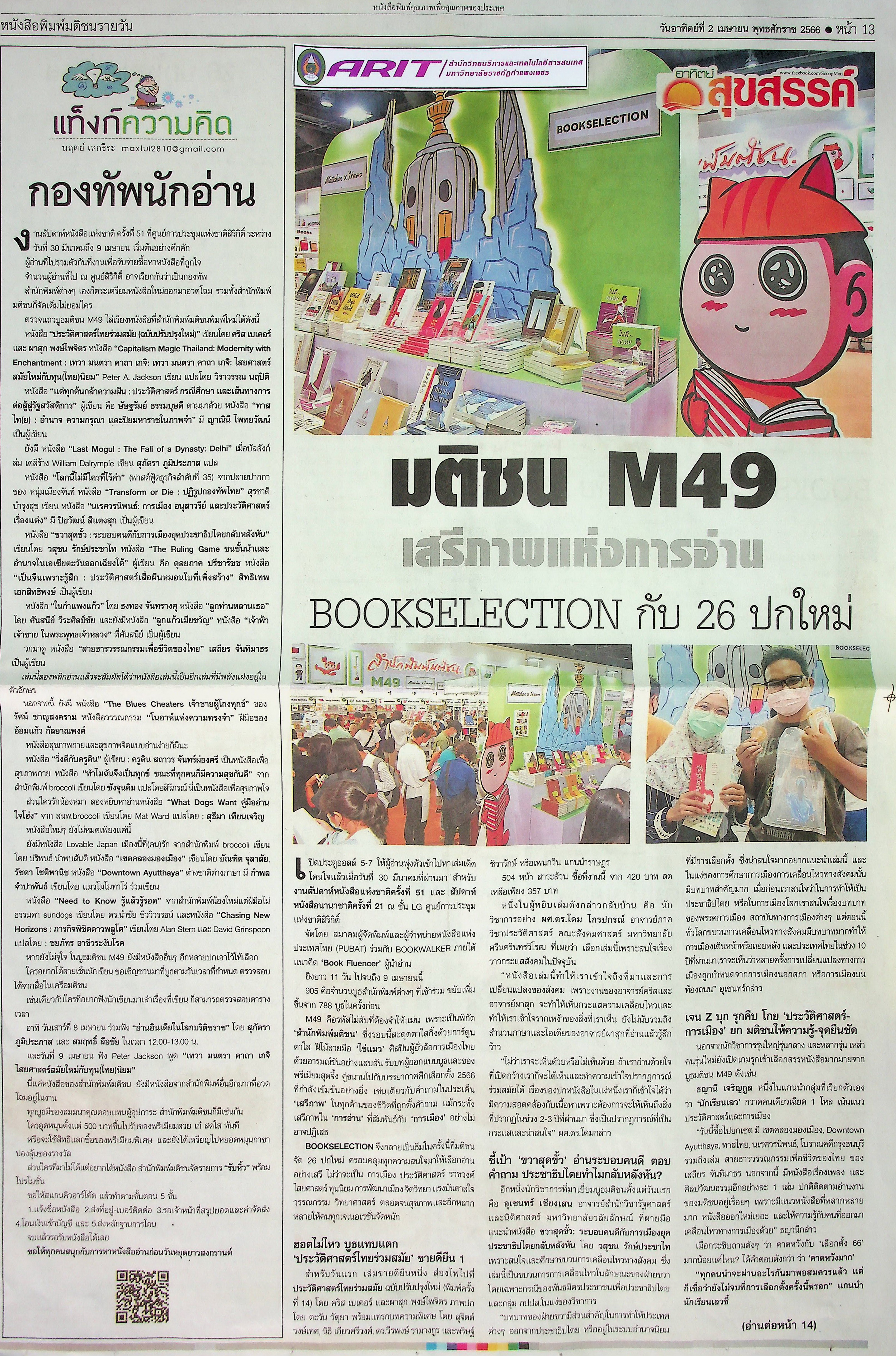 | หัวข้อข่าว | มติชน M49 เสรีภาพแห่งการอ่าน BOOKSELECTION กับ 26 ปกใหม่ | ผู้จัดทำ | น.ส.มาลี ประสงค์ดี |